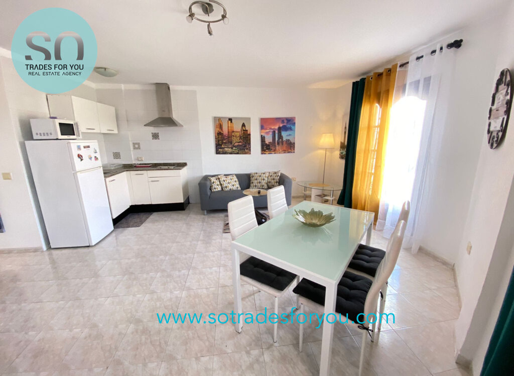 The apartment features a bright open-plan layout with a living area and a fully equipped American-style kitchen — perfect for enjoying time with family or friends. Large windows allow in plenty of natural light throughout the day.