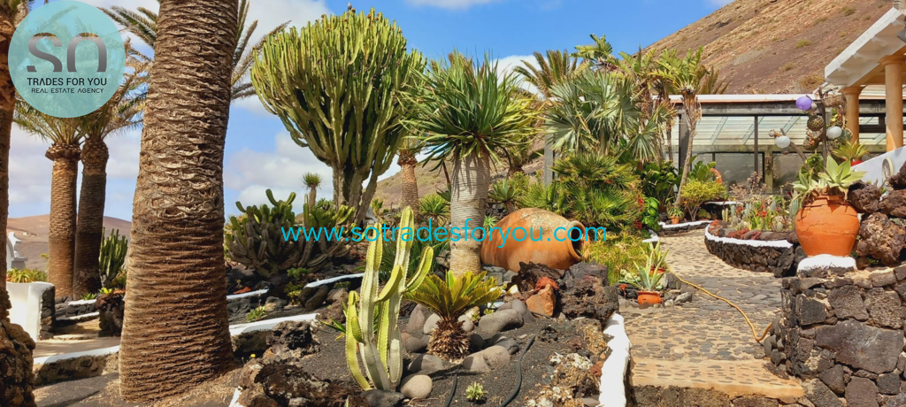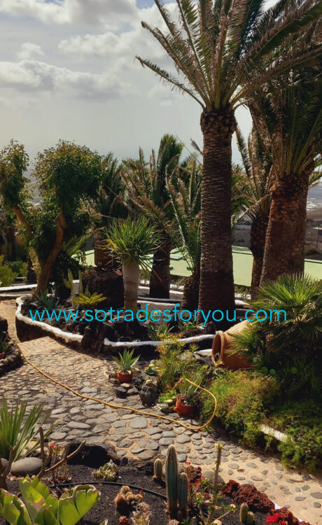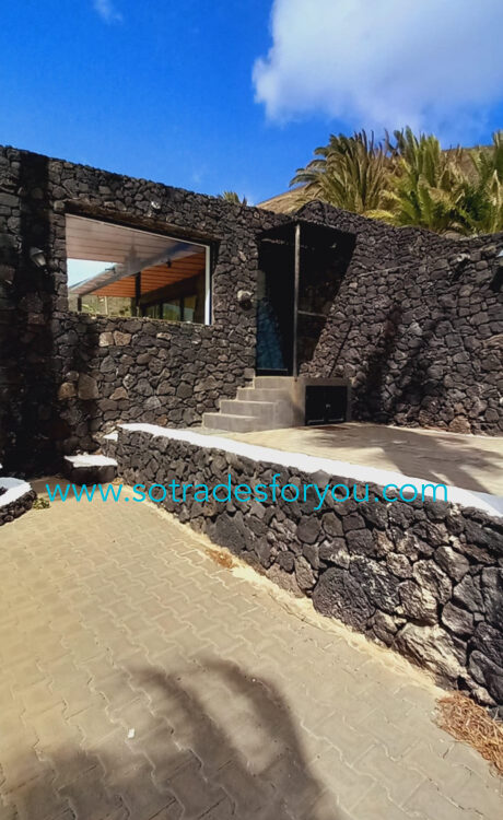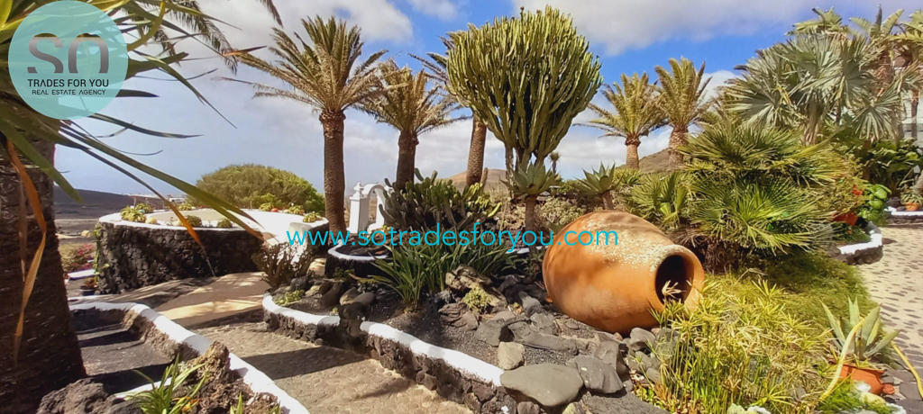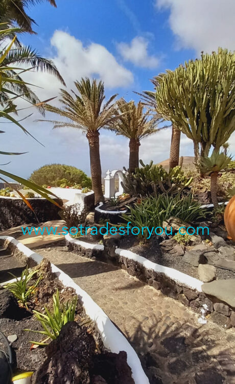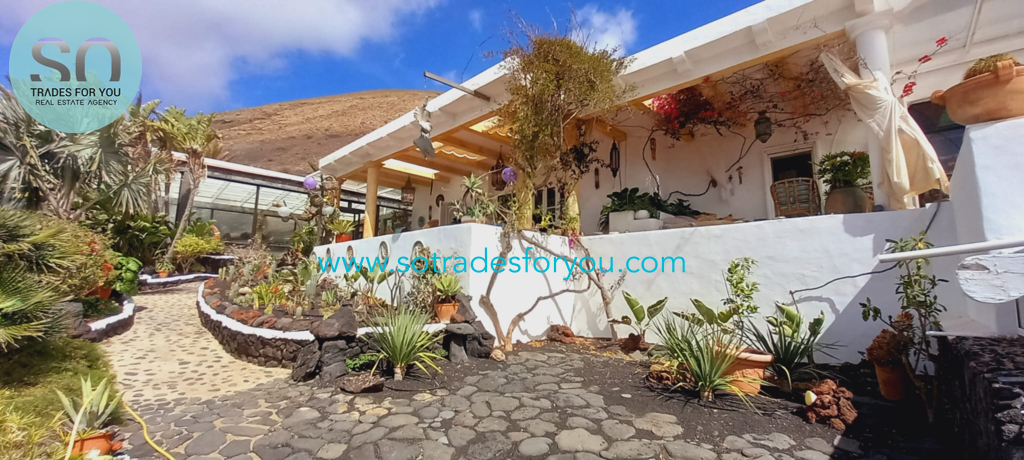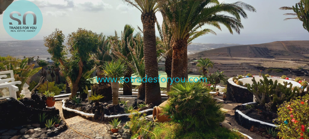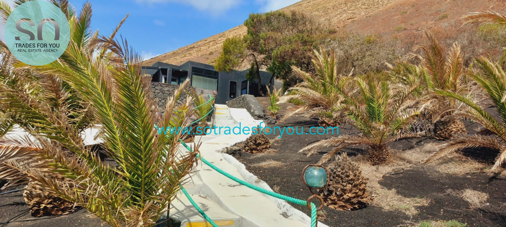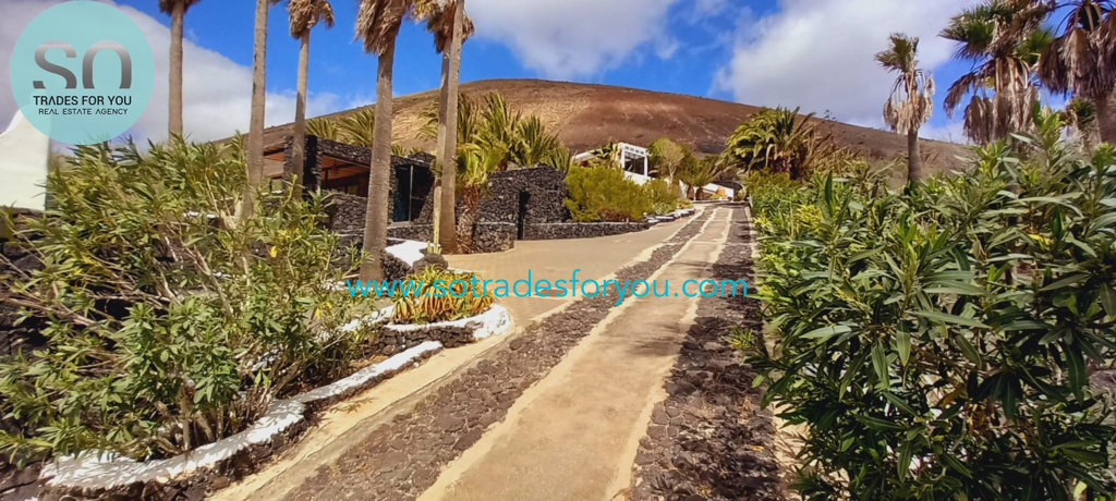 www.sotradesforyou.com offers for sale this impressive and green luxury property in La Asomada, Tías, Lanzarote. This unique property of 750 m2 is located in a privileged location of 40,000 square meters of land, placed on the side of a volcano, surrounded by an oasis of greenery, offering a unique panoramic view that only the natural beauty of the island of Lanzarote can bring you. The real estate part of this property is built on 4 levels, each with a breathtaking view of the ocean and the surrounding area. The main house, of unique elegance, opens onto a large bright patio, leading to a large living/dining room, extended by a large terrace overlooking the green garden with multiple areas of tranquility. You will also find 3 en-suite bedrooms, each including its own dressing room and bathroom. A large kitchen with central island, fully equipped, a wine cellar, a large covered garage for two cars, as well as a heated indoor swimming pool. The numerous interior spaces demonstrate great comfort, offering your