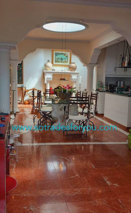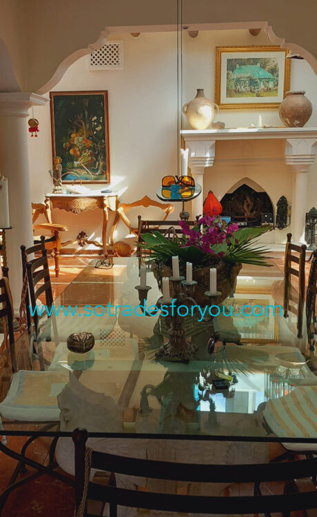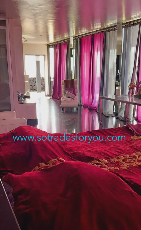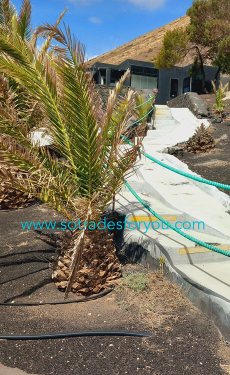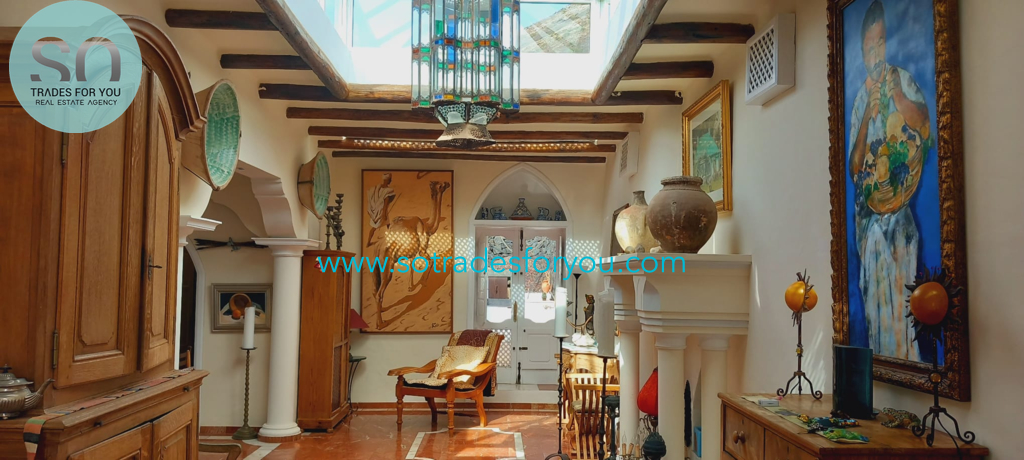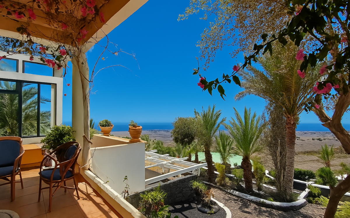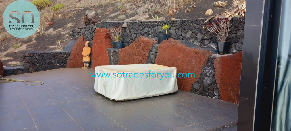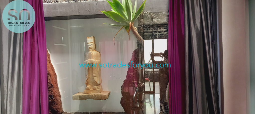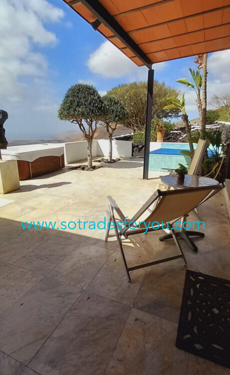 www.sotradesforyou.com offers for sale this impressive and green luxury property in La Asomada, Tías, Lanzarote. This unique property of 750 m2 is located in a privileged location of 40,000 square meters of land, placed on the side of a volcano, surrounded by an oasis of greenery, offering a unique panoramic view that only the natural beauty of the island of Lanzarote can bring you. The real estate part of this property is built on 4 levels, each with a breathtaking view of the ocean and the surrounding area. The main house, of unique elegance, opens onto a large bright patio, leading to a large living/dining room, extended by a large terrace overlooking the green garden with multiple areas of tranquility. You will also find 3 en-suite bedrooms, each including its own dressing room and bathroom. A large kitchen with central island, fully equipped, a wine cellar, a large covered garage for two cars, as well as a heated indoor swimming pool. The numerous interior spaces demonstrate great comfort, offering your