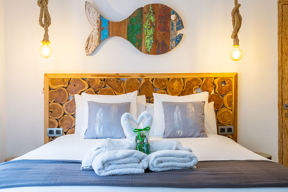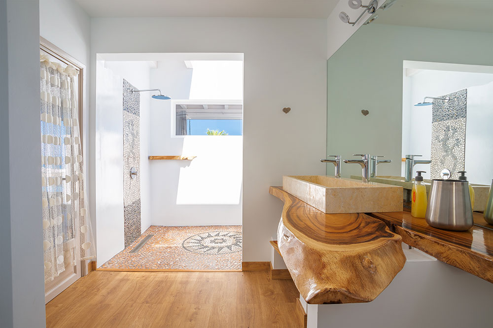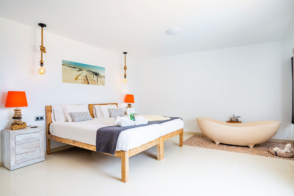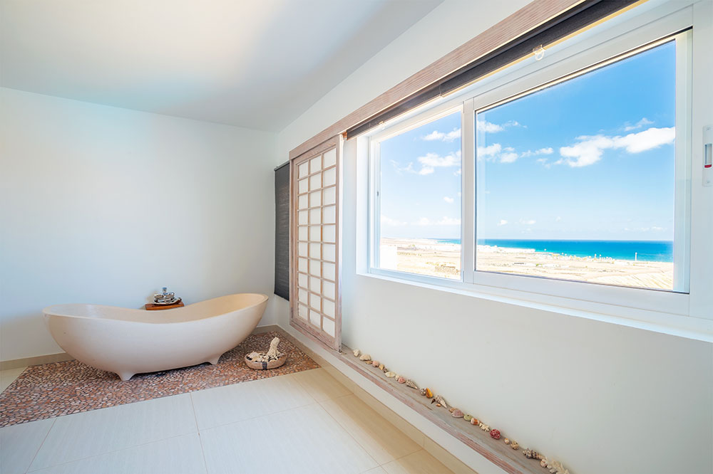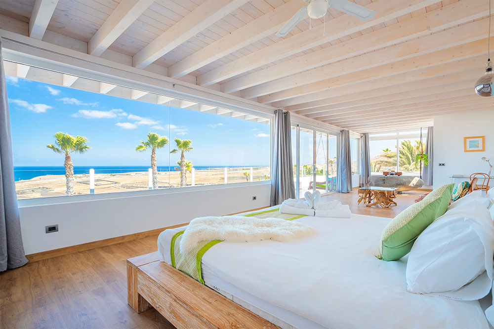 The villa offers six bedrooms across multiple levels, including several en-suite suites with king-size beds. The master suite occupies the upper level and features ocean views, an outdoor bathtub and a separate shower.